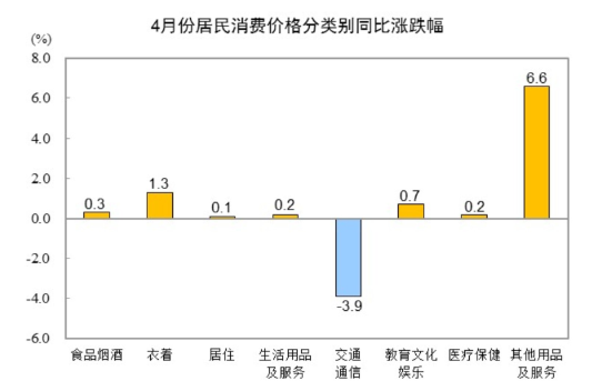 其他七大類價格同比六漲一降。其中,其他用品及服務、衣著、教育文化娛樂價格分別上漲6.6%、1.3%和0.7%,生活用品及服務、醫(yī)療保健、居住價格分別上漲0.2%、0.2%和0.1%;交通通信價格下降3.9%。