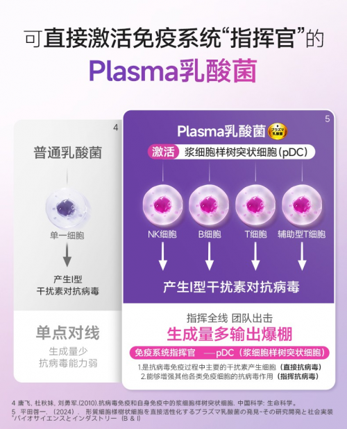 Plasma乳酸菌是全球首個(gè),目前唯一被發(fā)現(xiàn)能夠直接激活預(yù)防病毒感染免疫系統(tǒng)“指揮官”的乳酸菌,能直接作用于免疫系統(tǒng)的關(guān)鍵指揮塔——pDC(漿細(xì)胞樣樹突狀細(xì)胞),從而高效支持免疫功能的維持。
