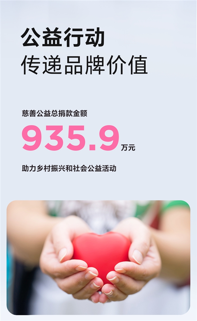 與此同時,在2023年搭建的“一基一臺,四梁八柱”ESG戰(zhàn)略實(shí)現(xiàn)體系基礎(chǔ)上,2024年的愛瑪科技不僅始終堅(jiān)持綠色低碳發(fā)展理念,更始終踐行“愛社會”公益理念,將可持續(xù)發(fā)展理念貫穿于整個價值鏈。2024年,愛瑪科技慈善公益總捐款金額935.9萬余元,通過助力鄉(xiāng)村振興等社會公益活動將踐行企業(yè)公民責(zé)任和產(chǎn)業(yè)責(zé)任真正落到了實(shí)處,以高度社會責(zé)任感和擔(dān)當(dāng)意識贏得了廣泛的社會贊譽(yù)。
