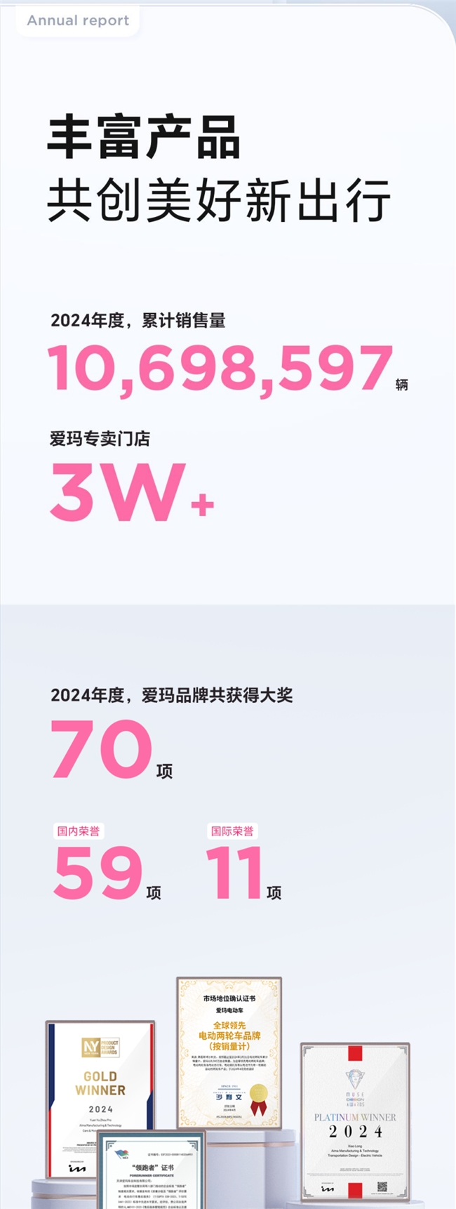 不僅如此,在報(bào)告中還提到,在2024年度,愛瑪科技累計(jì)銷量10698567輛,愛瑪專賣門店數(shù)量3萬+家。由此可見,依托“時尚+科技”雙輪驅(qū)動、渠道效率優(yōu)化及全球市場布局,疊加國內(nèi)以舊換新政策紅利,愛瑪科技精準(zhǔn)洞察市場趨勢并牢牢把握,不僅贏得了廣大消費(fèi)者的青睞與喜愛,更獲得了業(yè)界的廣泛認(rèn)可。2024年,愛瑪品牌共獲得大獎70項(xiàng),其中國內(nèi)榮譽(yù)59項(xiàng),國際榮譽(yù)11項(xiàng),充分展示了愛瑪品牌的影響力和號召力。