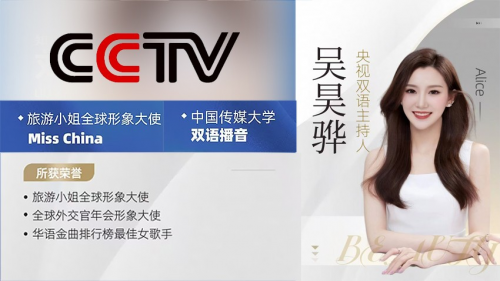 知名主持人:吳昊華,中國傳媒大學;CCTV明星雙語主持人;CCTV《星光大道》人氣冠軍;華語明星女歌手;