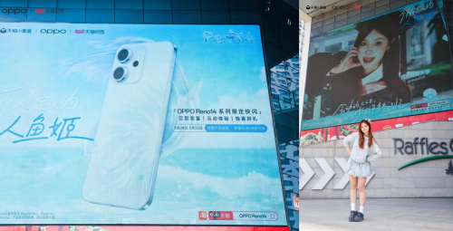 布局線下高頻消費場景:隨后,OPPO Reno14系列“人魚姬”主題視覺強勢登陸全國200+高校天貓校園門店電子屏,通過規模化的線下精準曝光,直接觸達超300萬高校學生群體。這一沉浸式傳播矩陣,配合線上社交媒體的裂變傳播,實現總曝光量突破1億+,為品牌上新構建了全域覆蓋的營銷勢能。