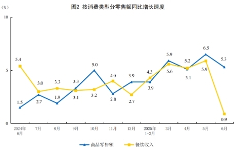 按消費類型分,6月份,商品零售額37580億元,同比增長5.3%;餐飲收入4708億元,增長0.9%。1—6月份,商品零售額217978億元,增長5.1%;餐飲收入27480億元,增長4.3%。