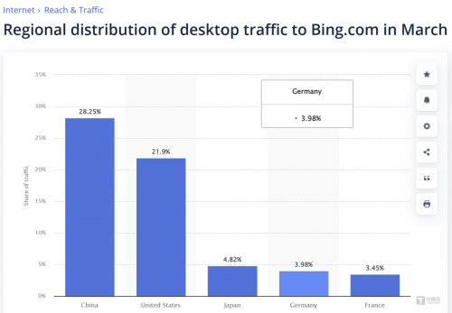 數(shù)據(jù)和市場(chǎng)研究平臺(tái)Statista顯示,2025年3月,中國(guó)貢獻(xiàn)了必應(yīng)搜索全球訪問(wèn)流量的28.25%,超越美國(guó)(21.9%),躍升為必應(yīng)全球第一大市場(chǎng)。這是必應(yīng)落地中國(guó)以來(lái)取得的重大突破,引起關(guān)注。