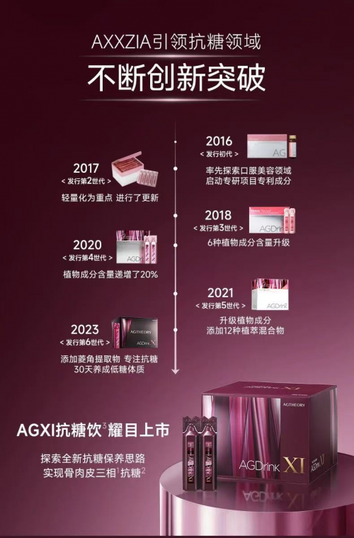 2025年4月,曉姿推出第11代AGXI抗糖飲,由曉姿聯合日本抗糖領域權威——米井嘉一教授共同研發,首次提出“分層抗糖抗老”的全新理念。