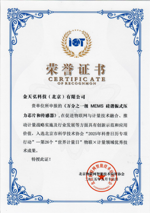 核心提示:2025年5月16日,第26個#世界計量日# 盛會落幕!金天弘科技攜 《萬分之一級MEMS諧振式壓力芯片和傳感器》 ,斬獲北京市科學技術協會權威認證 — 【物聯×計量領域優秀技術成果】 榮譽證書!金天弘科技自主研發的部分產品,萬分級MEMS諧振式壓力傳感器