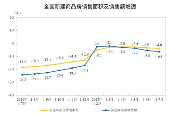 1—7月份,新建商品房銷售面積51560萬平方米,同比下降4.0%;其中住宅銷售面積下降4.1%。新建商品房銷售額49566億元,下降6.5%;其中住宅銷售額下降6.2%。