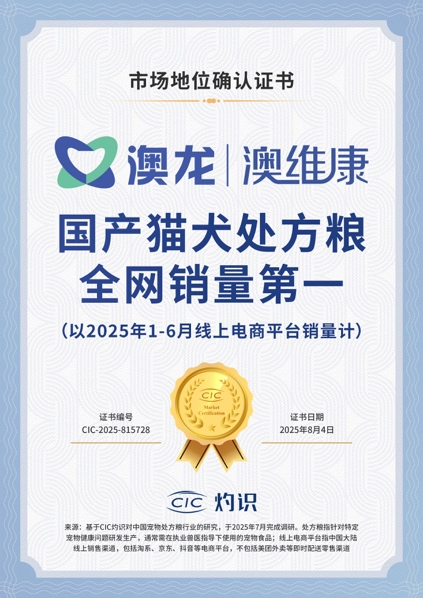 核心提示:近日,澳龍獲得由國際權威咨詢機構CIC灼識授予的“澳龍|益爾凈,國產耳螨軟膏全網銷量第一(以2024年線上電商平臺銷量計)”及“澳龍|澳維康,國產貓犬處方糧全網銷量第一(以2025年1-6月線上電商平臺銷量計)”市場地位確認證書!近日,澳龍獲得由國際權威咨詢機構CIC灼識授予的“澳龍|益爾凈,國產耳螨軟膏全網銷量第一(以2024年線上電商平臺銷量計)”及“澳龍|澳維康,國產貓犬處方糧全網銷量第一(以2025年1-6月線上電商平臺銷量計)”市場地位確認證書!