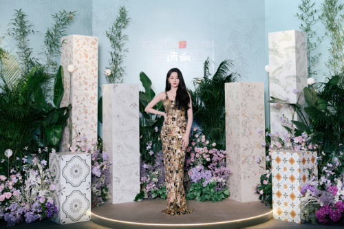 冠珠瓷磚全球品牌代言人迪麗熱巴身穿金色亮片長裙亮相活動現場,其典雅形象與「東方人居范式」新品大美同框,相偕相融,盡顯東方人居意境之美。