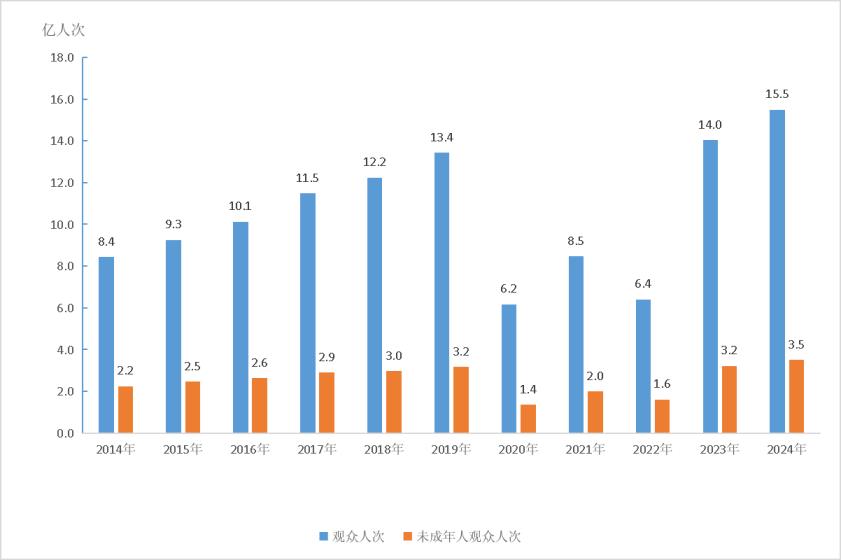 圖4:2014—2024年全國(guó)文物機(jī)構(gòu)接待觀眾人次及未成年人觀眾人次