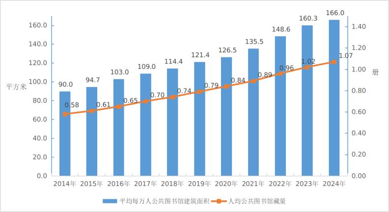 2024年末,全國(guó)平均每萬人公共圖書館建筑面積166平方米,比上年末增加5.7平方米;全國(guó)人均圖書藏量1.07冊(cè),比上年末增加0.05冊(cè);全年全國(guó)人均購(gòu)書費(fèi)1.5元,與上年基本持平。