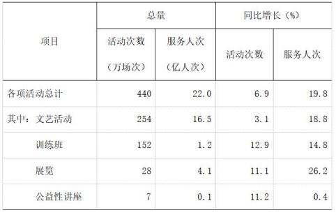 全年全國(guó)群眾文化機(jī)構(gòu)共組織開展各類文化活動(dòng)440萬場(chǎng),同比增長(zhǎng)6.9%;服務(wù)22億人次,同比增長(zhǎng)19.8%。