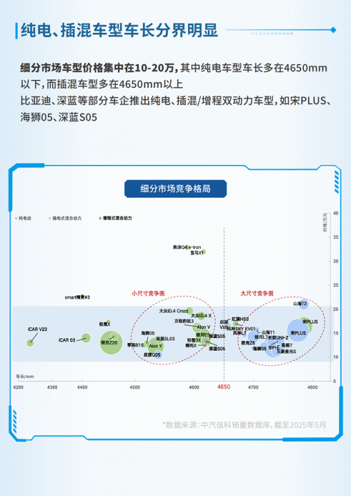 報告顯示,純電與插混車型形成清晰分界:純電車型車長多在4,650mm以下,插混車型多在4,650mm以上。比亞迪元PLUS、宋PLUS等車型表現出“碾壓式優勢”,位列銷量前列。整體上,自主品牌憑借先發優勢與高性價比在中低價位區間占據主導,而合資品牌則依靠技術下放和本土化策略尋求突破,競爭日趨激烈。