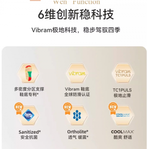 比如學步期的 “穩穩鞋” 系列,核心依托 “Vibram 極地科技” 打造 “6 維創新穩科技”,上市不到一年銷量破億。其通過多密度分區支撐鞋底專利提供精準支撐、Vibram 防滑認證鞋底搭配 TC1PULS 極地止滑技術減少打滑風險、Sanitized® 技術保障足部衛生、Ortholite® 材質實現透氣緩震、COOLMAX® 材質加速透氣排濕,從支撐、防滑、抗菌、透氣、緩震多維度,全方位保障兒童在四季不同場景下的穩定、舒適與健康穿著體驗。