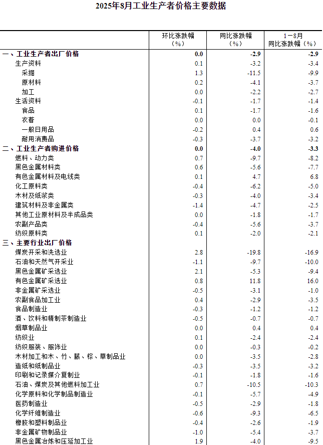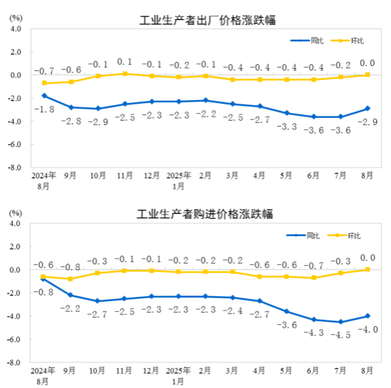 核心提示:2025年8月份,全國工業生產者出廠價格同比下降2.9%,降幅比上月收窄0.7個百分點,環比由下降0.2%轉為持平。工業生產者購進價格同比下降4.0%,環比持平。1—8月平2025年8月份,全國工業生產者出廠價格同比下降2.9%,降幅比上月收窄0.7個百分點,環比由下降0.2%轉為持平。工業生產者購進價格同比下降4.0%,環比持平。1—8月平均,工業生產者出廠價格比上年同期下降2.9%,工業生產者購進價格下降3.3%。
