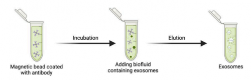 該方法操作流程包括:樣品預處理去除大顆粒雜質;抗體與磁珠偶聯;樣品與偶聯磁珠孵育使外泌體特異性結合;磁性分離并洗滌去除非特異性結合物;最后通過適當條件,例如低pH緩沖液,來洗脫捕獲的外泌體。