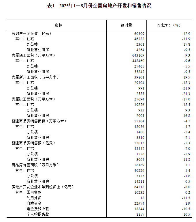 2025年1—8月份全國房地產(chǎn)市場基本情況