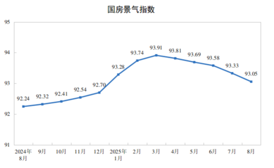 8月份,房地產(chǎn)開發(fā)景氣指數(shù)(簡稱“國房景氣指數(shù)”)為93.05。
