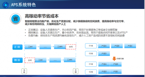 正排算法:設備人員緊前生產,充分利用產能,常用于處理緊急訂單或者交貨期答復。倒排算法:設備人員緊后生產,最小化庫存,優化現金流,常用于提高合同齊套率以及JIT生產。負載均衡:保持各生產線資源均衡化連續生產,減少人工排產造成的資源不連續和空閑浪費。生產線換線換模頻率優化,基于相同產品屬性,支持共模合并生產排產。根據產線/設備屬性(最大產能,成本等),結合產品屬性適配產線。設置工序前置緩沖間隔期,即可對每道工序指定日期開始排程,實現分段排產,使每個工序在指定的時間段內資源和產能得到充分利用(如共模合并生產,減少換模換線),使企業掌握各個工段的產能與需求情況,促進識別瓶頸工序,從而有針對性地調配資源 (人力/設備等), 緩解瓶頸工序的產能壓力, 同步減少上下游工序的庫存積壓和等待時間。