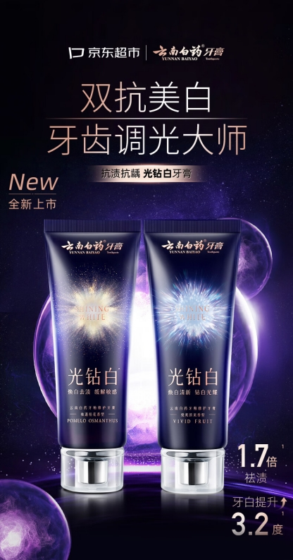 基于此洞察,2025年京東超市與國貨老品牌云南白藥深度攜手推出光鉆白系列產品,以突破性的雙抗調白科技為核心,使其具有1.6倍以上的祛漬力,且能在7天內幫助修護受損牙釉質。