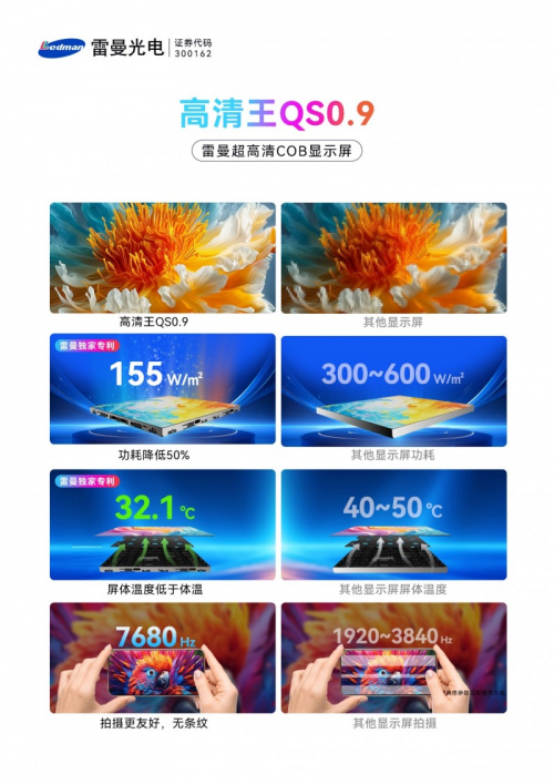此型號產品匯集雷曼光電十多項前沿技術和專利,切入日益增長的超高清0.9mm間距COB超高清大屏市場,廣泛應用于各類高清專業大屏顯示、商業大屏顯示,高貴不貴,在保證超高清顯示的前提下,價格更親民,能耗節省50%,屏體溫度低于體溫,高刷新率讓拍攝效果更好,低溫讓產品壽命更長,還有其他更多獨有優勢!
