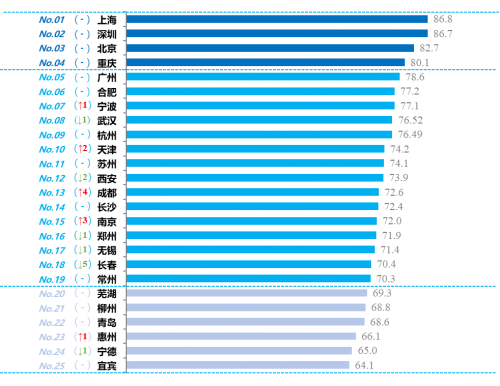 從總指數看,25座城市繼續分為三個梯隊,但第一、二梯隊城市數量擴容。第一梯隊城市評估分值大于80分,綜合競爭優勢明顯,由3座城市擴容至4座城市,其中上海、深圳、北京繼續保持前三位,重慶分值突破80分,進入領跑方陣。第二梯隊城市評估分值在70-80分之間,具有獨特比較優勢,由13座城市擴容至15座城市,分別是廣州、合肥、寧波、武漢、杭州、天津、蘇州、西安、成都、長沙、南京、鄭州、無錫、長春、常州。第三梯隊城市評估分值在60-70分之間,在細分領域各有特色長板或較大發展潛力,主要有6座城市,分別是蕪湖、柳州、青島、惠州、寧德、宜賓。