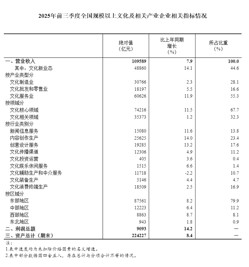 2025年前三季度全國規(guī)模以上文化及相關(guān)產(chǎn)業(yè)企業(yè)營業(yè)收入增長7.9%