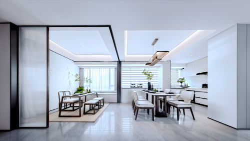 而餐廳可與旁邊的書房打通,形成一邊就餐,一邊飯后喝茶的空間,房子使用率和空間感得到大跨度提升。