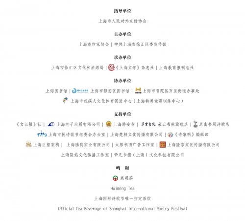 本屆詩歌節(jié)的指導(dǎo)單位為上海市人民對外友好協(xié)會,主辦單位為上海市作家協(xié)會和中共上海市徐匯區(qū)委宣傳部。詩歌節(jié)將邀集國內(nèi)外二十多位有影響的詩人,包括著名外國詩人何塞·路易斯·迪亞斯·格拉納多斯(哥倫比亞)、克勞迪奧·波扎尼(意大利)、弗拉米尼亞·克魯恰尼(意大利)、馬蒂亞斯·波利蒂基(德國)、索尼婭·布雷斯勒(法國)、伊麗莎·魯埃達(dá)(西班牙)、馬可·索佐尼(意大利)、露西·英格里什(英國)、馮海城(馬其頓)、馬里奧·梅倫德斯(智利)、卡蒂察·庫拉芙科娃(馬其頓)、瑪麗亞·戈麥斯·拉拉(哥倫比亞)、趙燕芬(新加坡),拉蒙·科特·巴拉伊瓦爾(哥倫比亞)。中國詩人有謝冕、胡弦、繆克構(gòu)、梁曉明、張曉雪、王欽剛、高秀芹、崖麗娟、阿依古麗、鄒勝念等著名詩人、翻譯家和文學(xué)評論家。本屆詩歌節(jié)將舉辦豐富多彩的詩歌朗誦、交流和文學(xué)研討,邀請文學(xué)、文化、教育等社會各界人士和熱愛文學(xué)的市民共同參與。