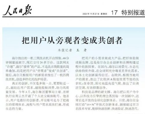 《人民日報》17版則聚焦一臺洗衣機(jī)背后的創(chuàng)新故事。海爾三筒洗衣機(jī)預(yù)售48分鐘銷量破萬、交付超20萬臺的成績,源于一場“用戶許愿、企業(yè)接單”的共創(chuàng)實(shí)踐。今年3月,海爾集團(tuán)董事局主席、首席執(zhí)行官周云杰開通了個人社交媒體賬號,直接傾聽用戶聲音,推動管理流程與用戶需求高效對接。依托“10+N”開放式創(chuàng)新體系,海爾跟用戶共創(chuàng)出能分區(qū)洗護(hù)的三筒洗衣機(jī),隨后又迭代出“懶人洗家族”以及一機(jī)四筒洗衣機(jī),滿足多樣化的洗護(hù)需求。