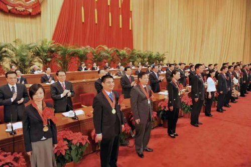 中共中央宣傳部原副部長、中國文聯原黨組書記/副主席、中國關心下一代工作委員會常務副主任胡振民為江蘇黃埔再生資源利用有限公司董事長陳光標頒發榮譽