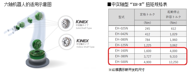 “KINEX”系列作為兼具高精度、高剛性和低噪音的大型減速機,被廣泛應用于工業機器人的關鍵部位以及需要高精度定位的機床等領域。此次新增的3種大型尺寸(EH-160N/380N/500N)兼具“更高剛性”與“輕量緊湊化”特性。即使在重負荷條件下也能保持穩定精度,實現設備設計的自由度提升與空間節省。同時,通過“KINEX”系列可支持中型至大型工業機器人(負載重量為130~300kg)的6軸結構,以覆蓋小型至大型機型的統一產品線,全面應對持續擴張的機器人市場對大型化需求的廣泛挑戰。