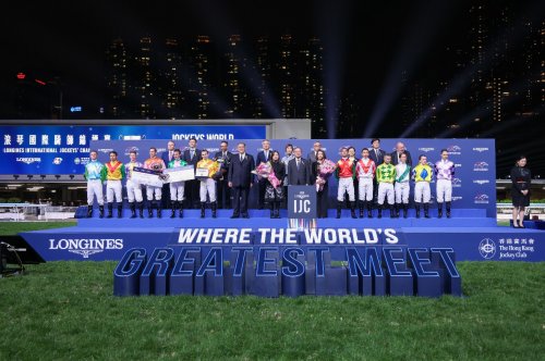 浪琴國際騎師錦標(biāo)賽頒獎儀式舉行后嘉賓、馬會董事及行政總裁應(yīng)家柏 (上排最左)與參賽騎師合照。