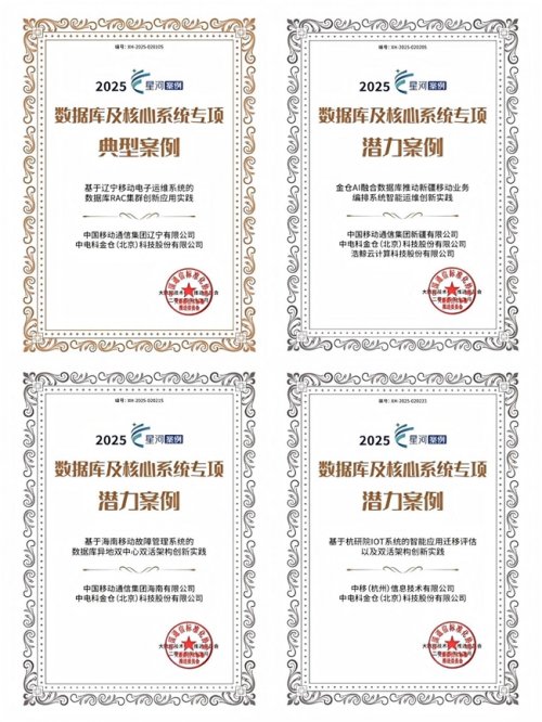 在此次評選中,“基于遼寧移動電子運維系統的數據庫RAC集群創新應用實踐”獲評“數據庫及核心系統專項——典型案例”。“金倉AI融合數據庫推動新疆移動業務編排系統智能運維創新實踐”、“基于海南移動故障管理系統的數據庫異地雙中心雙活架構創新實踐”、“基于杭研院IOT系統的智能應用遷移評估以及雙活架構創新實踐”獲評“數據庫及核心系統專項——潛力案例”。