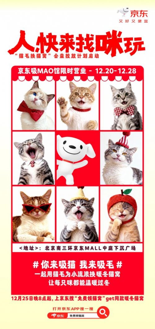 12月20日至28日,京東“吸MAO館”公益貓咖在京東MALL北京南三環(huán)店限時開業(yè),10只“貓咪店員”上崗。消費(fèi)者到店可參與吸貓互動,并在現(xiàn)場體驗寵物清潔家電趨勢新品。京東生活小家電同步將養(yǎng)寵家庭的清潔需求與流浪貓過冬救助結(jié)合,用戶在現(xiàn)場使用寵物清潔家電收集貓毛,吸到的貓毛越多,京東投放的貓窩就越多。