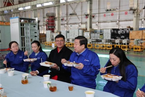 中午,潘委員與員工們圍坐一起在就餐,吃著份飯,喝著熱茶,其樂融融。董事長劉亞利向潘委員介紹,2025年中國電力在清潔能源轉型、市場建設、電網升級與保供能力等方面實現里程碑式突破,為我國電力實現飛躍發展做出了巨大貢獻。這其中也有北開中電集團員工的努力。