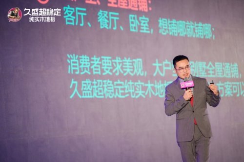 久盛地板有限公司營銷總經理李彭濤以“全場景應用”為關鍵詞,對久盛超穩定純實木地板消費者應用進行解讀。從純實木地暖地板領導者到“0膠0醛超穩定純實木地板”健康生活普及者,久盛致力于為每一個中國家庭提供“真健康,超穩定”的純實木地板解決方案。李彭濤在會議現場同時從營銷端給出了“破圈”方案,公布了“穩穩健康操”社交平臺互動項目、啟動“久盛·穩穩圖書館” 公益計劃及小紅書“超穩體驗官”在內的新媒體矩陣計劃,旨在用最真實的場景和最溫情的互動,讓真實的消費者和體驗官直接鑒證久盛超穩定純實木地板的“真健康、超穩定”。