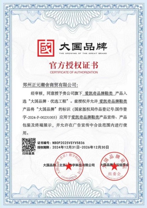 核心提示:“大國品牌”項目由國家相關部門指導推動,旨在遴選并培育一批代表中國形象、具有國際競爭力和高度社會責任感的優秀民族品牌。北京訊 近日,國內知名襪品品牌“愛凱奇”(AIKAIQI)再次憑借其卓越的品牌綜合實力,成功入選“大國品牌優選工程”,并獲頒官方授權證書(證書編號:NB0P2025VSYV5836),授權期限至2026年12月30日。這是繼此前獲得認證后,愛凱奇品牌實力與影響力的又一次國家級認可,標志著其在品牌建設、產品質量、技術創新及社會責任等方面的持續領先地位,穩固躋身中國品牌“國家隊”行列。