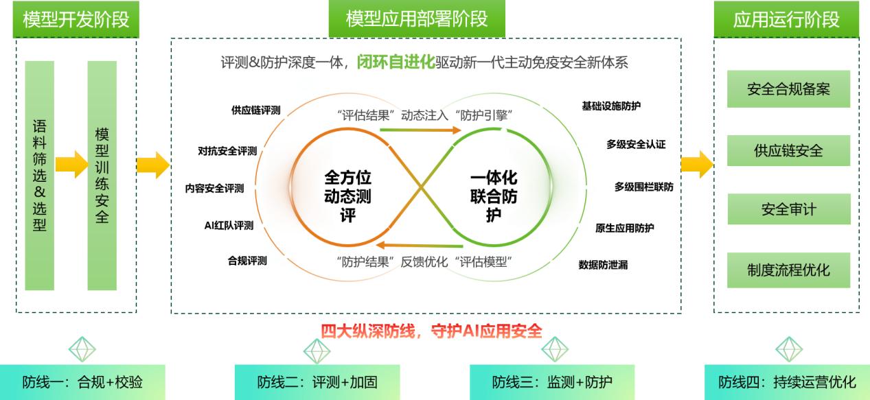 大模型系統部署階段,構建“評測+加固”和“監測+防護”閉環自進化雙道協同防線。讓“評測”明確“防護”重點,“防護結果”反哺“模型評測”,打造“越用越聰明”的主動免疫體系。在大模型系統上線前,需圍繞內容安全、對抗安全、AI紅隊、供應鏈等多維度開展安全評測,保障大模型系統安全上線;在大模型系統部署時,需圍繞基礎設施、模型、應用、數據等打造縱深防御,部署多級安全認證、多維聯防圍欄、原生應用防護、數據防泄漏等監測防護能力,打造特殊場景安全代答能力,守護大模型系統應用安全。
