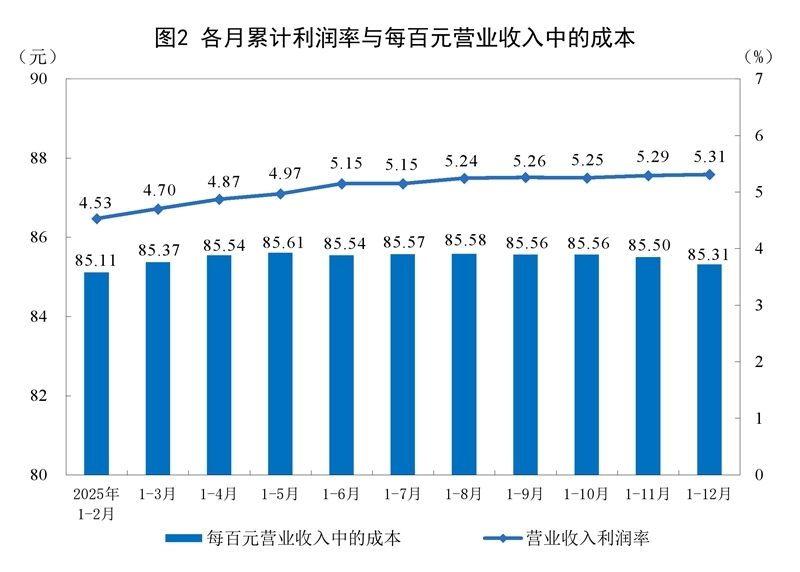 2025年,規模以上工業企業每百元營業收入中的成本為85.31元,比上年增加0.16元;每百元營業收入中的費用為8.62元,比上年減少0.02元。