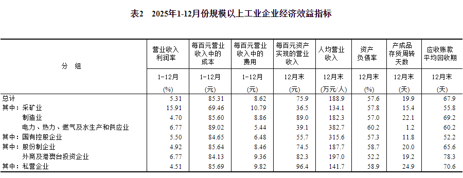 2025年末,規模以上工業企業每百元資產實現的營業收入為75.9元,比上年末減少2.7元;人均營業收入為188.9萬元,比上年末增加5.5萬元;產成品存貨周轉天數為19.9天,比上年末增加0.6天;應收賬款平均回收期為67.9天,比上年末增加3.6天。