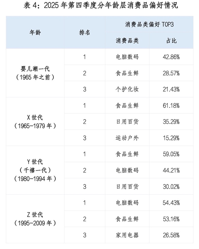 在代際消費特征方面,各年齡層消費偏好雖有差異,但食品生鮮與電腦數碼成為多代際共同的高頻消費品類。