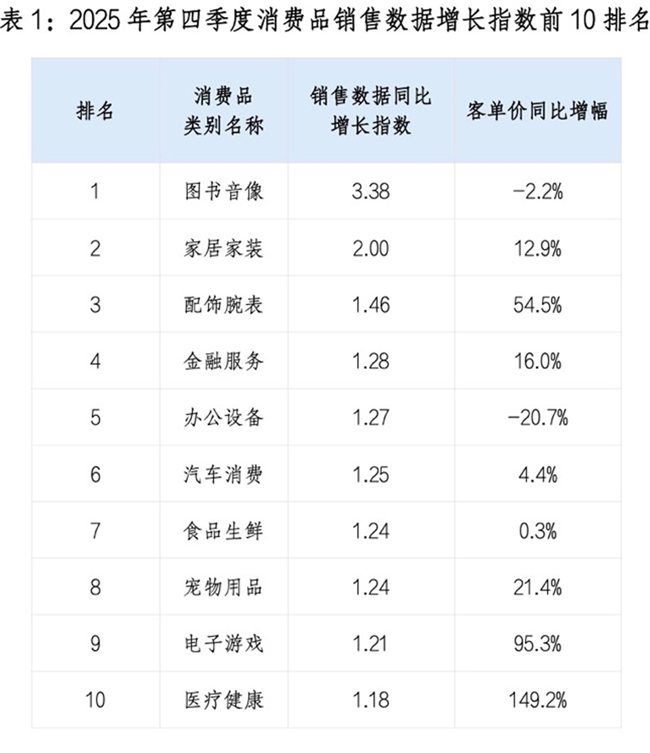 其中,圖書音像受知識付費與熱門IP內容帶動,保持高增長但客單價小幅下降;家居家裝在年末交付與煥新需求集中釋放下穩健增長,客單價同步提升;配飾腕表在節日禮贈與投資型消費驅動下,客單價顯著上行,消費結構呈現高端化趨勢。