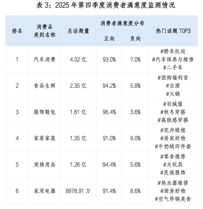 其中,汽車消費滿意度穩定,市場關注點已從購車環節延伸至全周期的維保與流通服務;食品生鮮在節日節點與團購模式帶動下保持較高滿意度,但品控與性價比仍是市場核心關注點。