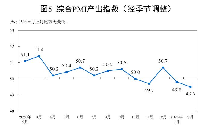 2月份,綜合PMI產(chǎn)出指數(shù)為49.5%,比上月下降0.3個(gè)百分點(diǎn),表明我國(guó)企業(yè)生產(chǎn)經(jīng)營(yíng)活動(dòng)總體較上月有所放緩。