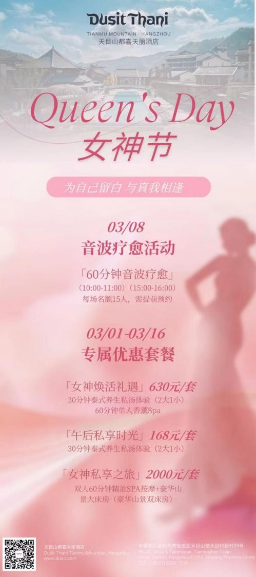 天目山都喜天麗酒店藏于天目山4A級生態區,春日森林療愈體驗已正式上線。3月,酒店特別推出系列專屬活動與優惠套餐,將春養智慧融入每一次呼吸與舒展。3月8日,音波療愈專場將于春日森林中啟幕。頌缽的悠遠音律將引導身心進入深度放松,讓春日的躁動在山林靜謐中歸于平和。活動設60分鐘專場兩場(10:00-11:00;15:00-16:00),每場限15人,需提前預約。3月1日至16日,三大女神主題套餐同步推出:煥活禮遇 630元:含2大1小私湯體驗及單人香薰SPA,讓溫潤泉水與芬芳療愈共同喚醒春日活力;午后時光 168元:含2大1小私湯體驗,適合家庭共享春日溫泉的愜意午后;私享之旅 2000元:含雙人精油SPA及豪華山景房一晚,于森林環抱中盡享二人世界的靜謐與奢華。所有體驗及套餐均可通過官方渠道咨詢預約。這個春天,都喜期待與每一位賓客相逢于山水之間,在泰式康養的溫柔照拂中,不負春日好時光。