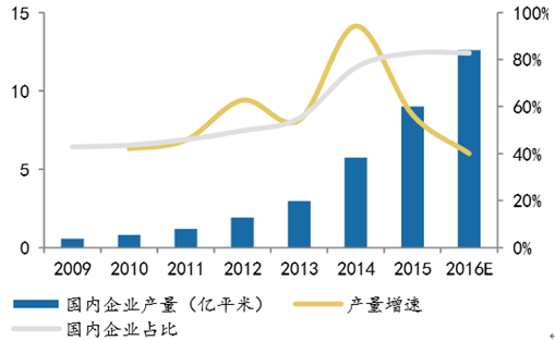 2013年,國內廠商鋰電隔膜產量2.96億m2,占國內市場總需求的54%,并且從2009年以來, 國產隔膜占比處于逐漸上升的態勢。但是,2013年以來,國內新能源動力汽車需求 量的暴增帶來高端鋰電隔膜需求的持續增加,雖然國內部分企業實現了高端隔膜技 術自主化生產,但依舊供不應求。雖然2015年產量增速下滑到56%,但產量基數在 持續放大,國產企業的占比在2014年就超過了70%,國產化進程正在提速。預計2016 年我國隔膜的產量占有率將進一步提升到82%左右。