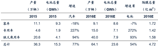 2016年新能源汽車(包含客車、乘用車、專用車)合計銷量 達55萬輛以上,電池需求量達19.5GWh。如果按照隔膜需求量20m2/kWh估算,2016 年將產生4.7億m2動力電池隔膜需求。