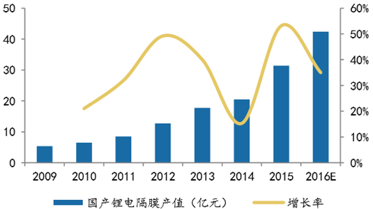 2009年中國隔膜市場規模為19.34億元,預計到2016年,隔膜市場規模將增長至89億元。其中,國產鋰電隔膜市場規模也在不斷增大,2009年產值規模為5.12億 元,但是增長速度從2012年起大幅下滑,受價格下降影響,2014年產值為20.5億元, 同比增增速下滑至15%。隨著國內產能的快速釋放,國產隔膜質量的提升以及價格邊際下降的趨勢放緩, 預計2016年產值規模將突破40億元。