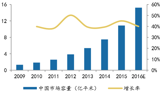 2009~2012年,國內鋰電市場主要由數碼產品需求驅動;2013年以來,新能源動力汽車的鋰電需求取代 平穩增長的數碼產品成為鋰電市場增長的動力源。鋰電池需求大增帶來鋰電隔膜需 求量的增加,近幾年國內鋰電隔膜需求保持40%~50%的增速,預計2016年國內市 場需求將達到15億平方米。